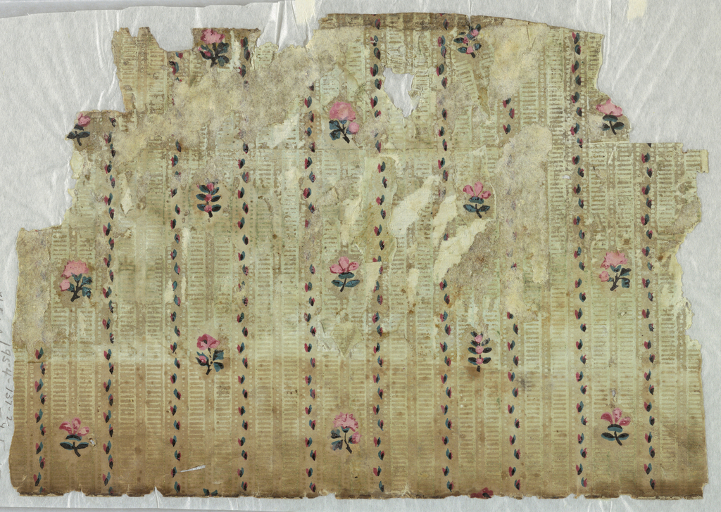 This is a Sidewall - fragment. It is dated 1770–75 and we acquired it in 1954. Its medium is block-printed on handmade paper. It is a part of the Wallcoverings department.