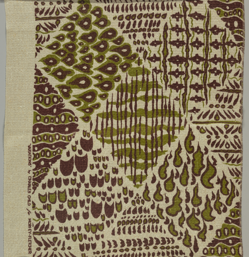 This is a Textile. It was designed by Charles Child and manufactured by Morley Fletcher Ltd., New York, NY. It is dated 1950–59 and we acquired it in 1954. Its medium is linen and its technique is silkscreen printed on twill weave. It is a part of the Textiles department.
