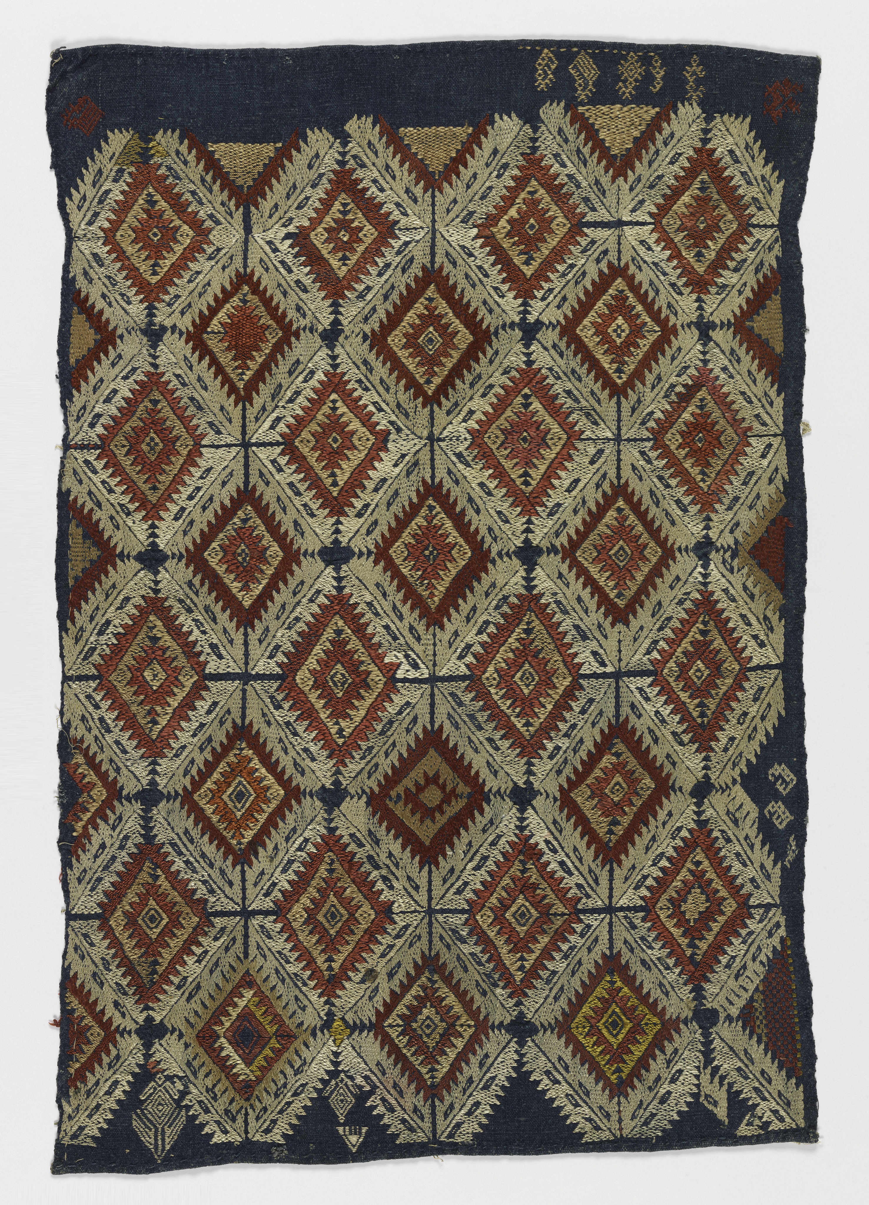 This is a Pillow cover. It is dated 18th century and we acquired it in 1955. Its medium is silk embroidery on linen foundation and its technique is embroidered in counted running stitch on plain weave foundation. It is a part of the Textiles department.