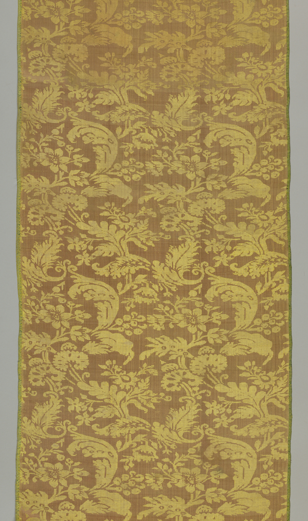 This is a Fragments. It is dated 18th–20th century and we acquired it in 1955. Its technique is fancy warp twill damask. It is a part of the Textiles department.