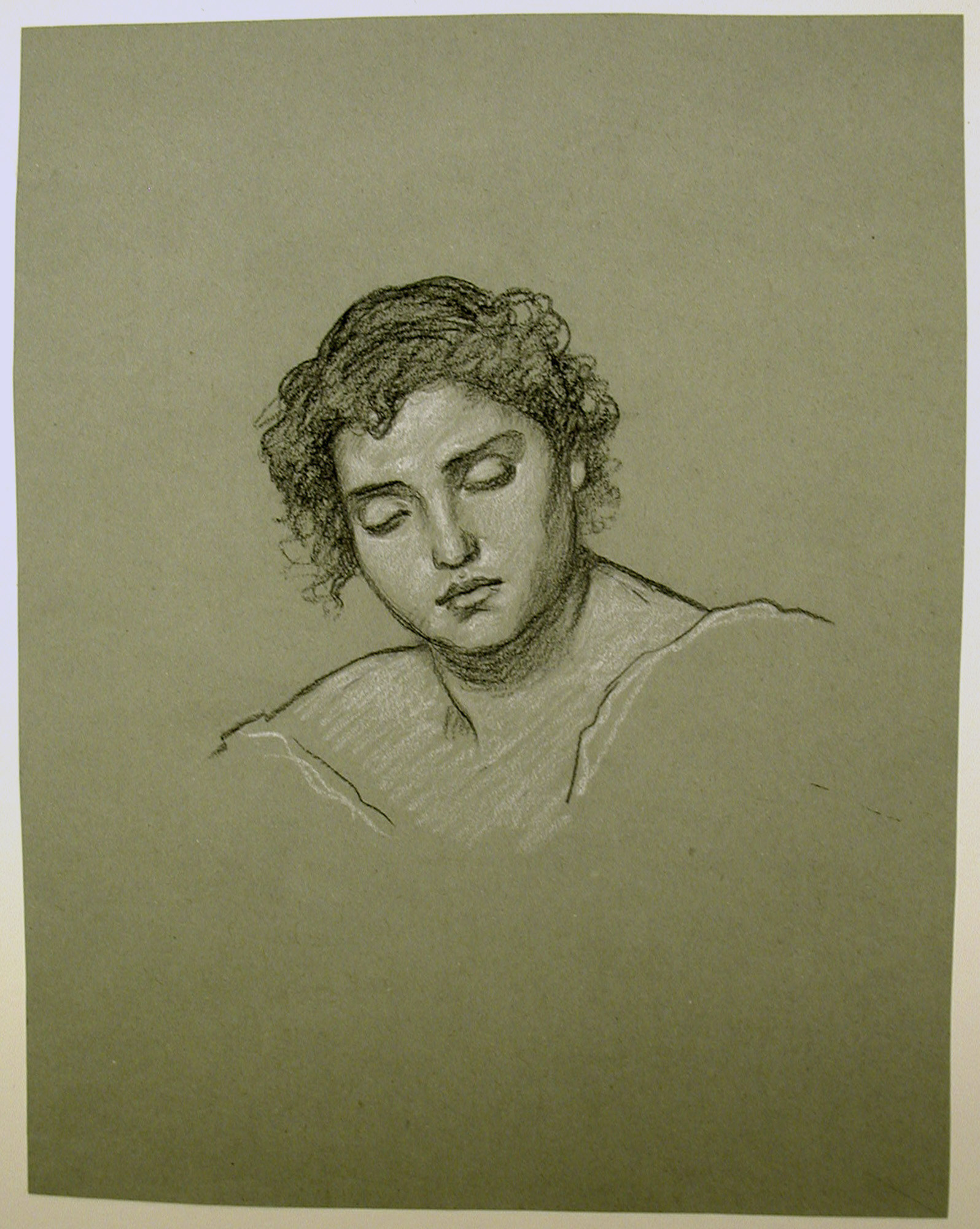 Drawing, Study for woman; Elihu Vedder (American, 1836 – 1923); USA; pastel crayon on gray-green paper; 32.3 x 25.4 cm (12 11/16 x 10 in.) ; Gift of the American Academy of Arts and Letters; 1955-38-11