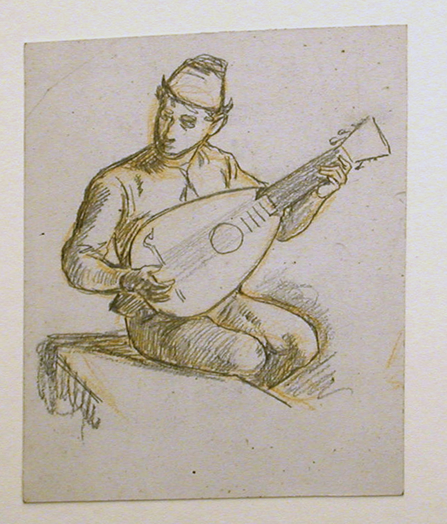 Drawing, Seated boy playing a lute; Elihu Vedder (American, 1836 – 1923); USA; pastel crayon on paper; 13.2 × 10.8 cm (5 3/16 × 4 1/4 in.); Gift of the American Academy of Arts and Letters; 1955-38-26
