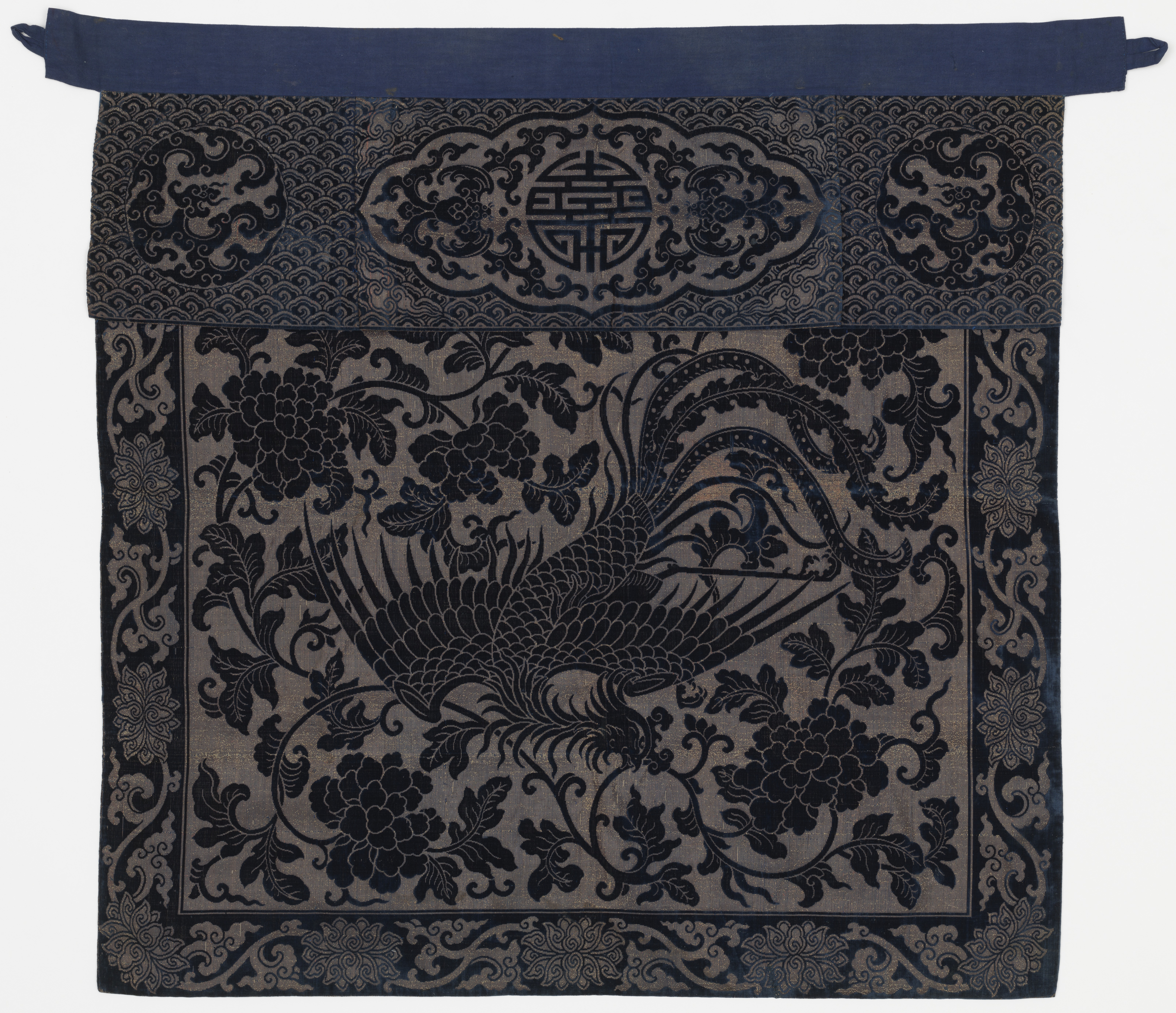This is a Hanging. It is dated 19th century and we acquired it in 1955. Its medium is silk, gilded paper, cotton lining and its technique is cut velvet. It is a part of the Textiles department.