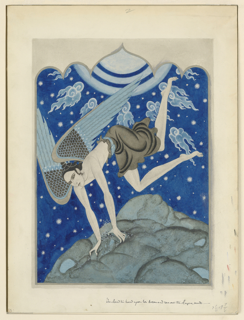 Drawing, Study for "Archangel Azrael closed his hand upon Earth's bosom and tore out the substance necessary," Illustration for Rudyard Kipling's "A New Version of What Happened in the Garden of Eden"; England; brush and watercolor, gouache, graphite, pen and black ink on illustration board; GIft of Martin Birnbaum; 1955-68-3