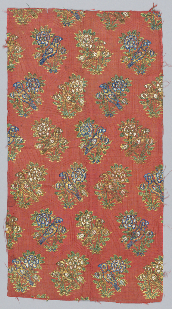 This is a Textile. It is dated 18th century and we acquired it in 1956. Its medium is silk, metallic thread and its technique is plain weave with supplementary weft. It is a part of the Textiles department.