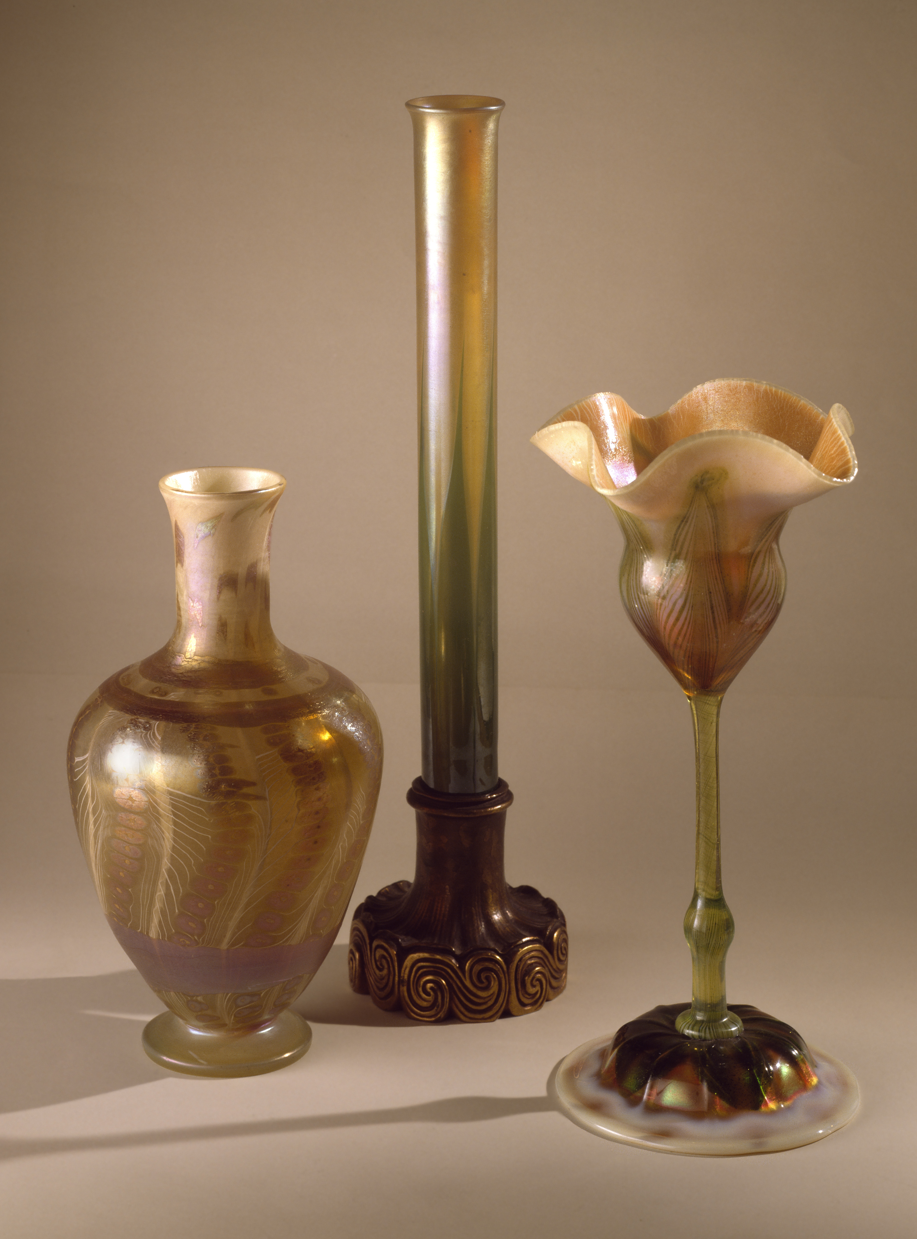 This is a Vase. It was overseen (as design director) by Louis Comfort and produced by Tiffany Glass and Decorating Company and manufactured by Tiffany Studios. It is dated ca. 1906 and we acquired it in 1956. Its medium is favrile glass. It is a part of the Product Design and Decorative Arts department.