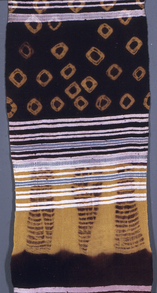 This is a Sash. We acquired it in 1956. Its medium is wool, cotton and its technique is tie-dye. It is a part of the Textiles department.