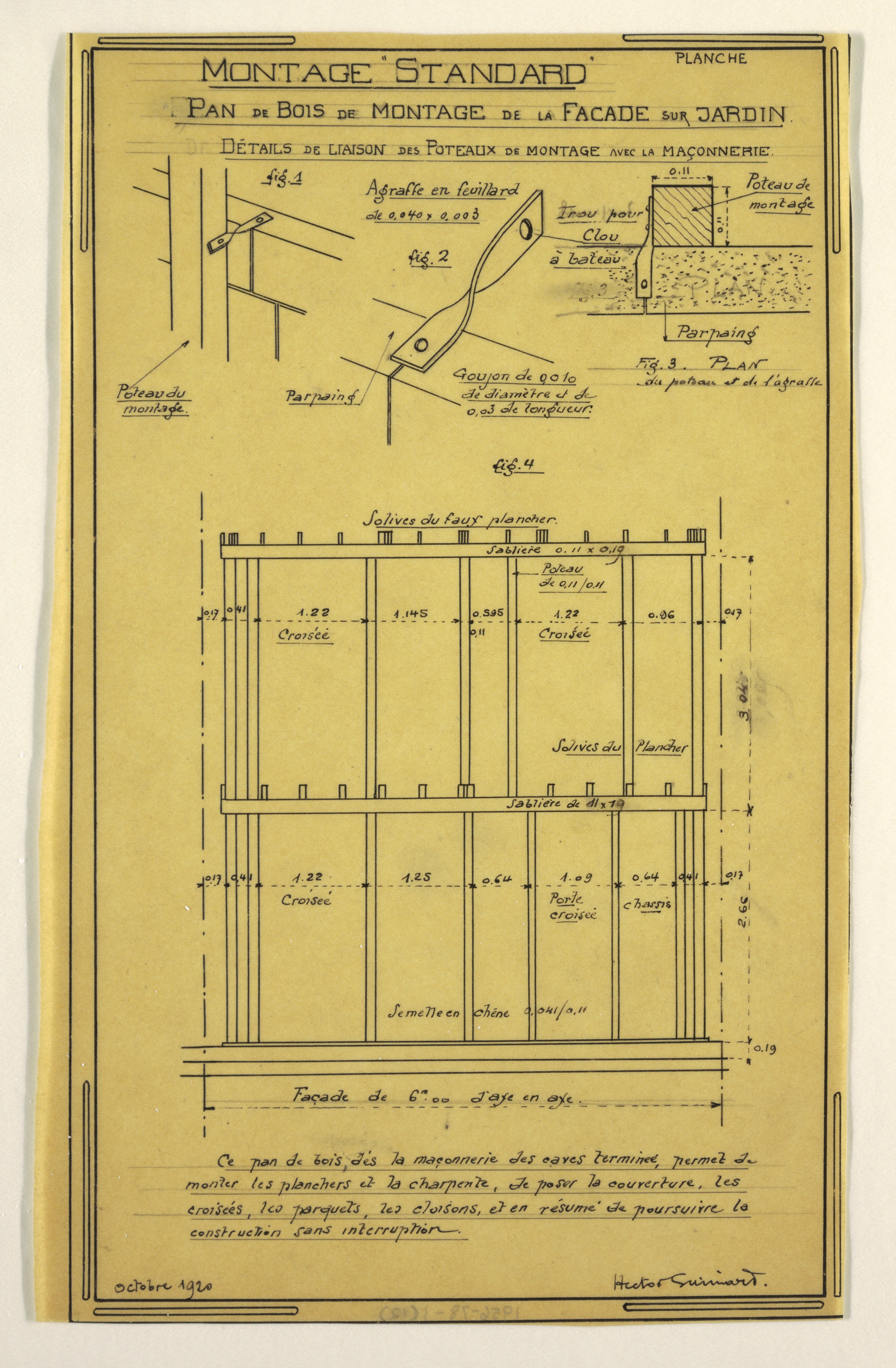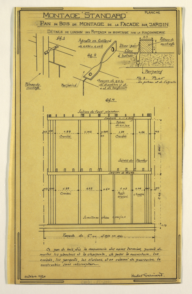 Inscribed in black ink, lower left: octobre 1920; upper margin: MONTAGE STANDARD/ PLAN DE BOIS MONTAGE FACADE SUR JARDIN