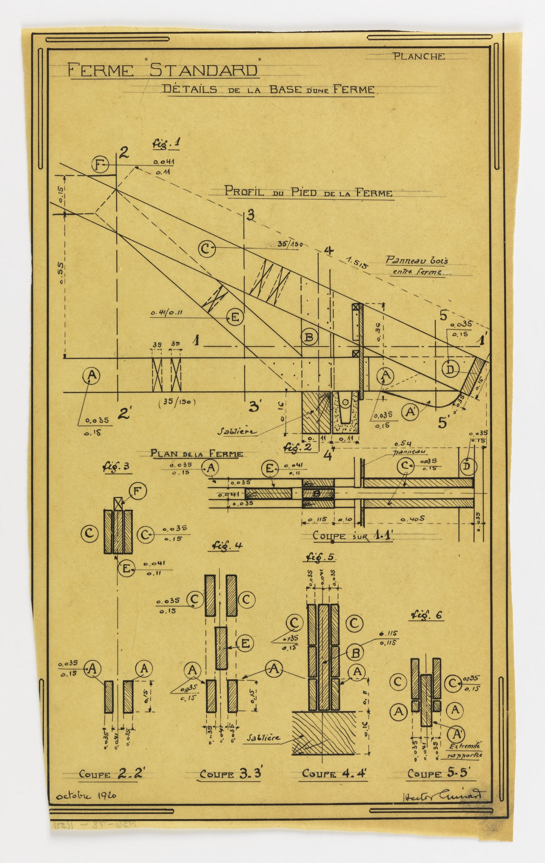 Inscribed in black ink, lower left: octobre 1920; upper margin: FERME STANDARD/ DETAILS DE LA BASE D'UNE FERME