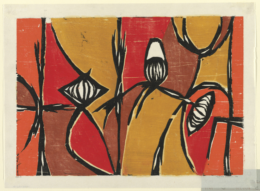 This is a Print. It was created by David Aurell Jr.. It is dated 1955 and we acquired it in 1956. Its medium is red, tan, brown and black ink on white. It is a part of the Drawings, Prints, and Graphic Design department.