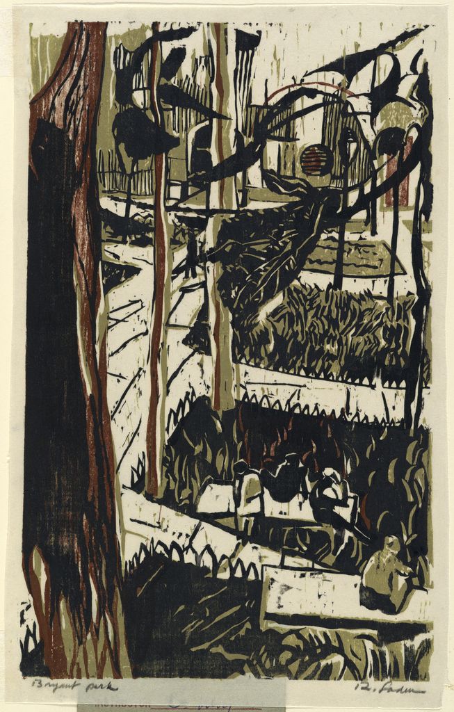 Print, Bryant Park; Robert Donald Laden (b. 1931); USA; woodcut in green, brown and black inks on white mulberry paper; H x W (Plate mark): 39.2 × 24.5 cm (15 7/16 × 9 5/8 in.) H x W (Paper): 42 × 26.2 cm (16 9/16 × 10 5/16 in.); 1957-104-5