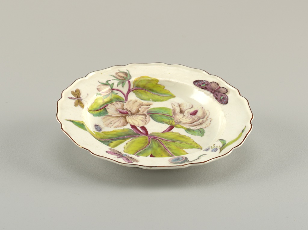 This is a plate. It was manufactured by Chelsea Porcelain Manufactory and after Georg Dionysius Ehret. It is dated 1754–1758 and we acquired it in 1957. Its medium is soft paste porcelain, vitreous enamel. It is a part of the Product Design and Decorative Arts department.