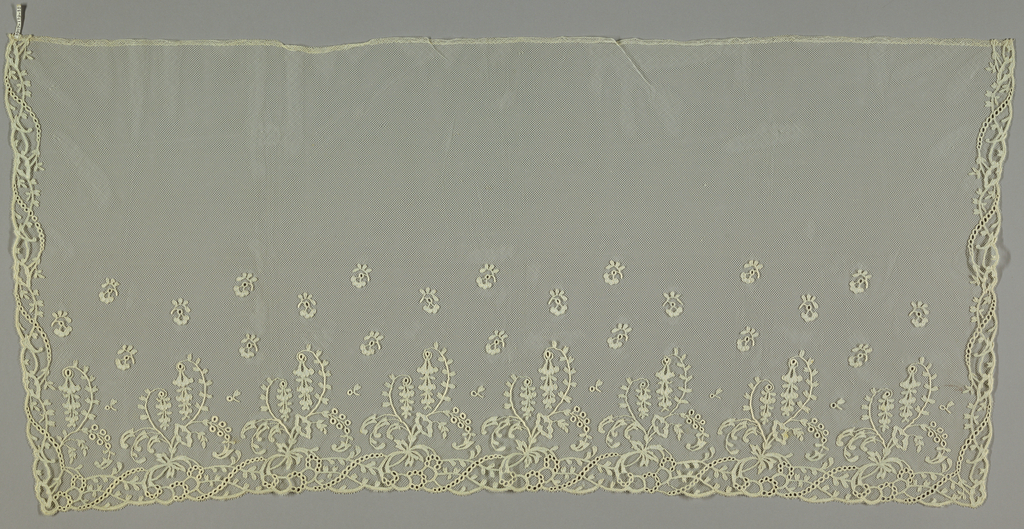 This is a Textile. We acquired it in 1957. Its technique is muslin appliquéd on net. It is a part of the Textiles department.