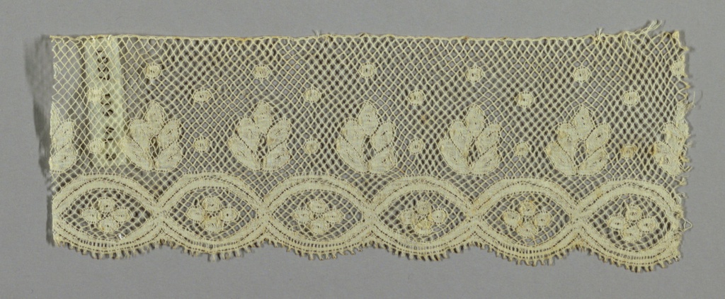 This is a Fragment. It is dated 19th century and we acquired it in 1957. Its medium is linen and its technique is bobbin lace, late valencienne ground. It is a part of the Textiles department.