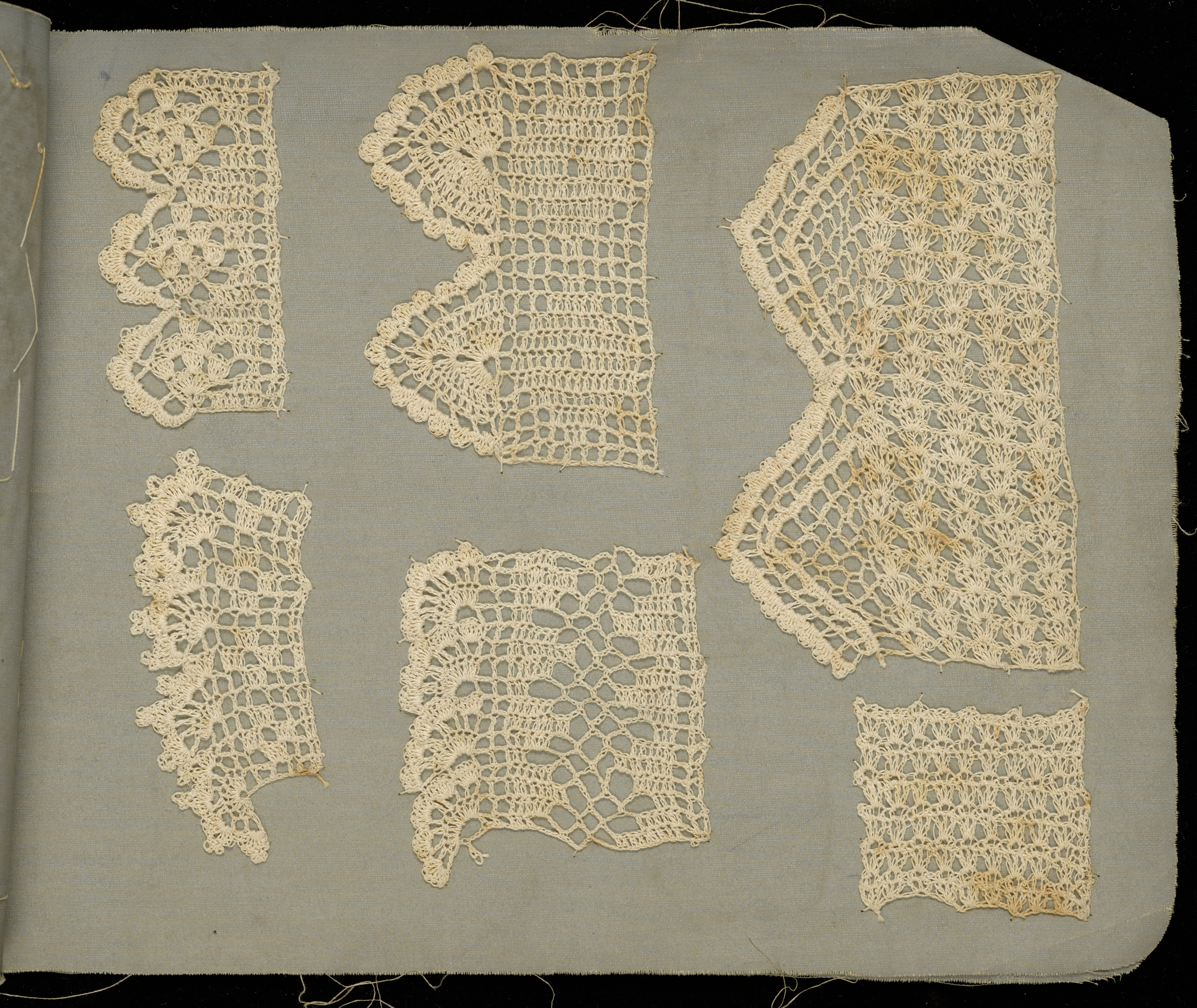 This is a Scrapbook of crochet samples. It is dated late 19th century and we acquired it in 1957. Its medium is linen, cotton and its technique is crochet. It is a part of the Textiles department.