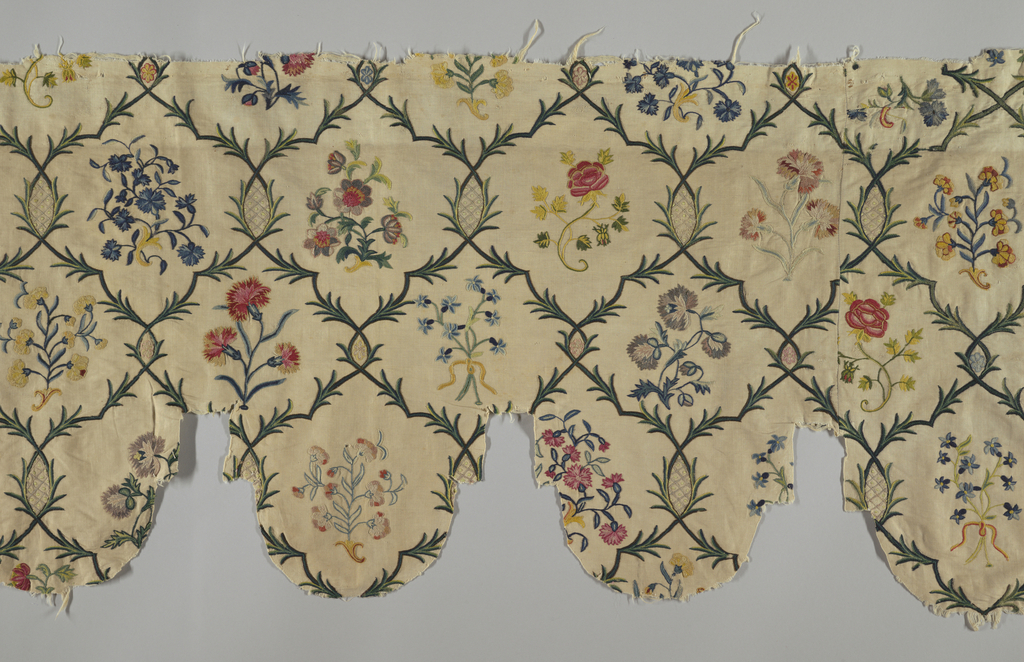 This is a Valance. It is dated late 18th century and we acquired it in 1957. Its medium is cotton, wool and its technique is chain stitch embroidery on plain weave. It is a part of the Textiles department.