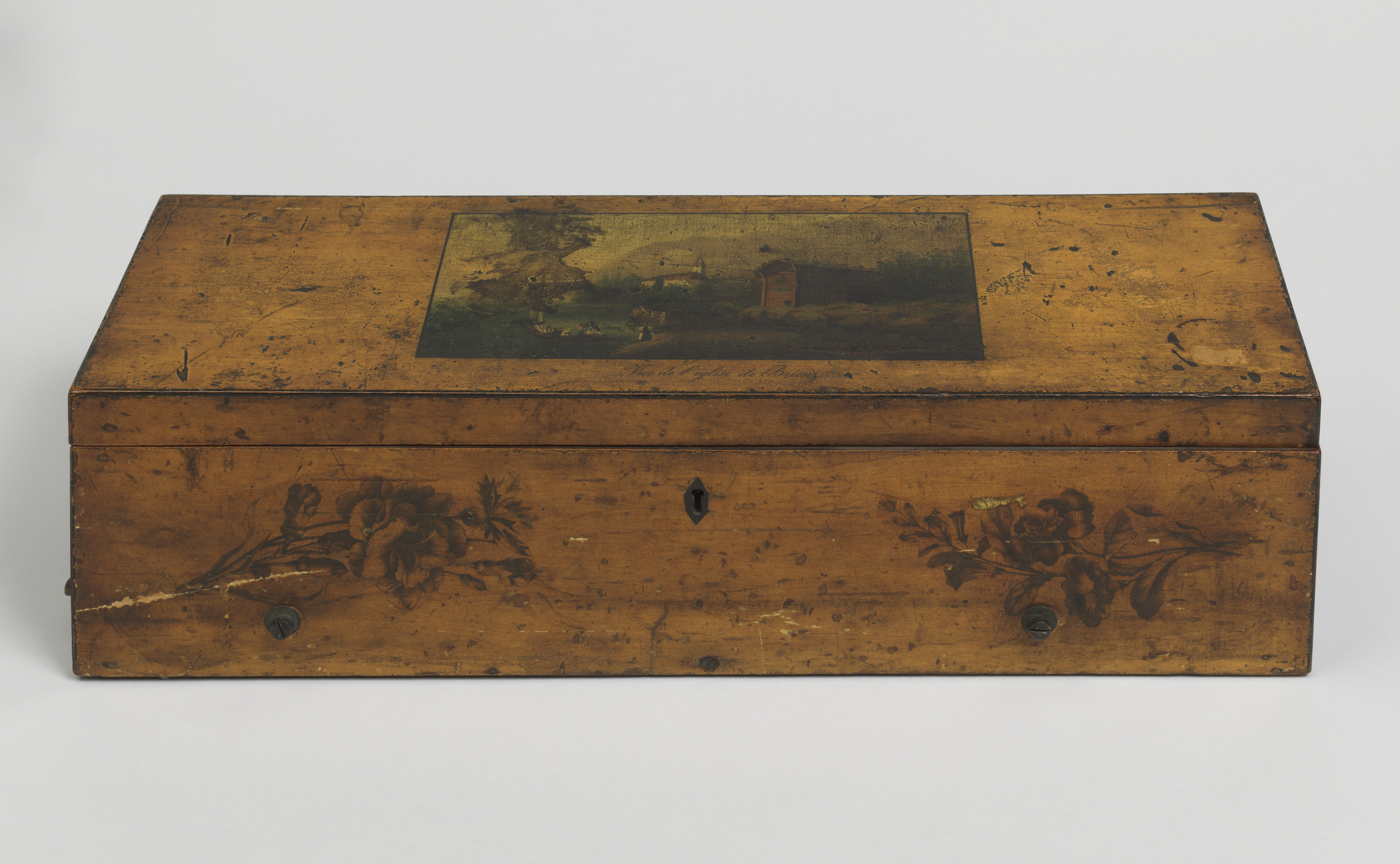 Music Box And Key; wood, brass, printed paper; H x W x D: 11.1 × 40.6 × 12.1 cm (4 3/8 in. × 16 in. × 4 3/4 in.); From the collection of Mrs. Lathrop C. Harper; 1957-165-1-a,b