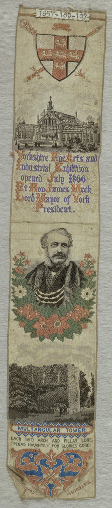 This silk bookmark was made by the workshop of Thomas Stevens to commemorate the 1866 Yorkshire Fine Arts and Industrial Exposition. From the top down, the bookmark shows the coat of arms of the city of York, an image of the pavilion built for the exposition, a portrait of the Mayor of York, James Meek, and an image of the ‘multangular tower’ which is a landmark in the city wall.