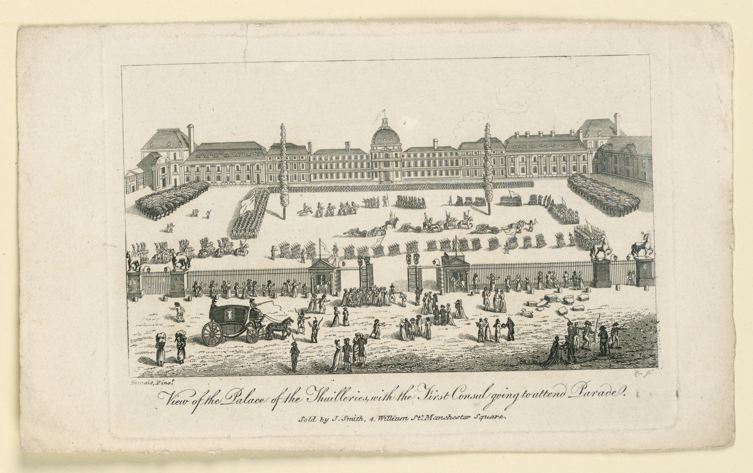 Inscribed below, lower left: "Desrais Pinxt.", lower right: "Pyr fct.", and in the center: "View of the Palace of the Tuilleries with the First Consul going to attend Parade." Below, "Sold by J. Smith, 4, William St., Manchester Square."