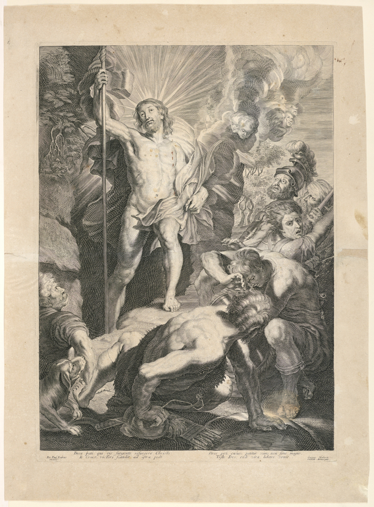 Print, The Resurrection; Print Maker: Gaspar Huberti (1630 - 1724); After Peter Paul Rubens (1577 – 1640); Netherlands; engraving on paper; Plate: 44 × 31.4 cm (17 5/16 × 12 3/8 in.) Paper: 52.2 × 38 cm (20 9/16 × 14 15/16 in.); 1957-41-28