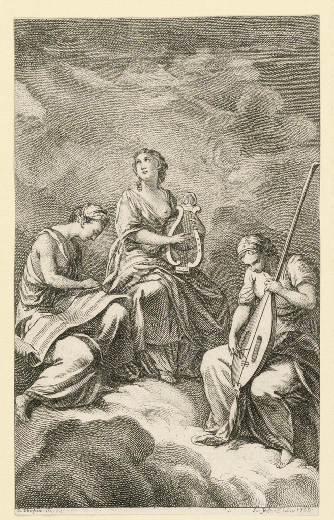 Print, Three Musical Graces; Print Maker: Étienne Fessard (French, 1714–1777); After Nicolas Poussin (French, 1594–1665); France; engraving on paper; 17.3 × 10.7 cm (6 13/16 × 4 3/16 in.); 1957-41-87
