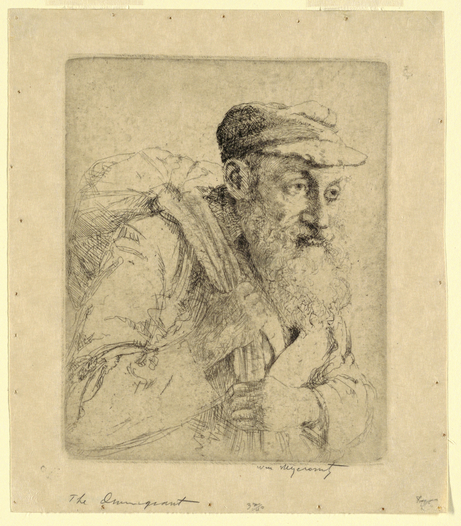 Print, The Immigrant; USA; etching in black ink on cream-colored japan vellum; Platemark: 18.6 × 15 cm (7 5/16 × 5 7/8 in.) Sheet: 23.3 × 20 cm (9 3/16 × 7 7/8 in.); Museum purchase through gift of the Estate of David Wolfe Bishop; 1957-44-1