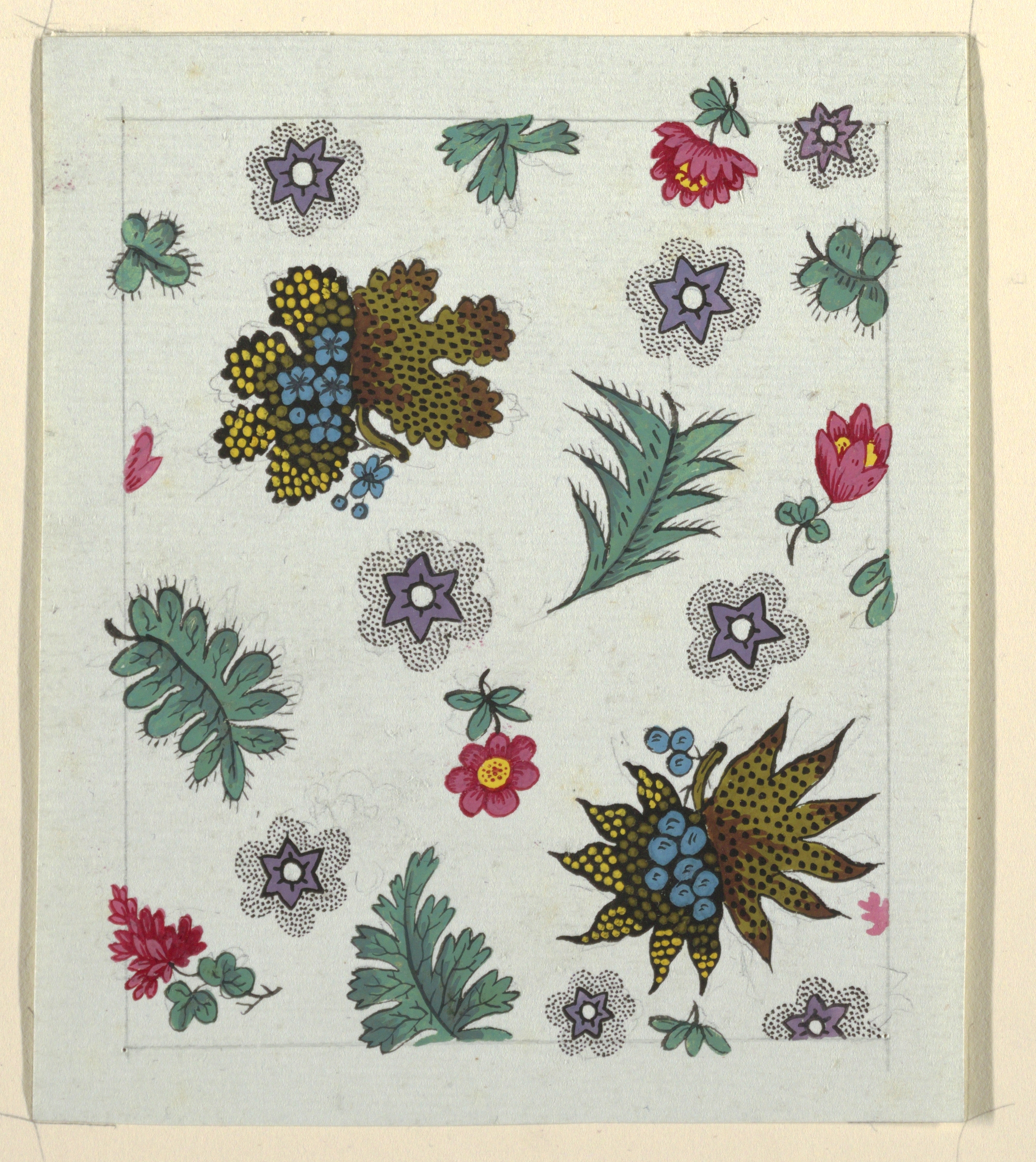 Drawing, Floral design for printed textile; Designed by Louis-Albert DuBois (Swiss, 1752–1818); France; brush and gouache, graphite on blue wove paper; Sheet: 13.5 x 11.5 cm (5 5/16 x 4 1/2 in.) Image: 11.4 x 9.4 cm (4 1/2 x 3 11/16 in.); Museum purchase from Friends of the Museum Fund; 1957-46-50
