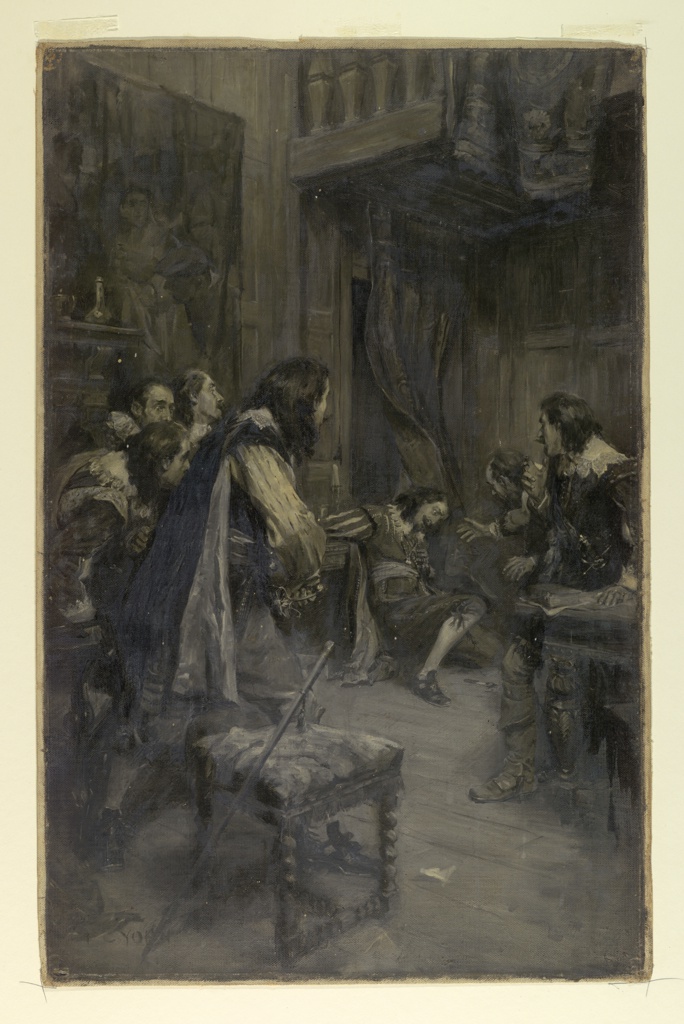 Drawing, The Assassination of the Duke of Buckingham by Felton; Frederick Coffay Yohn (American, 1875 - 1933); USA; brush and black, grey and white oil on canvas; 64 × 41.5 cm (25 3/16 × 16 5/16 in.); Gift of F. Elizabeth De Voy; 1957-58-2