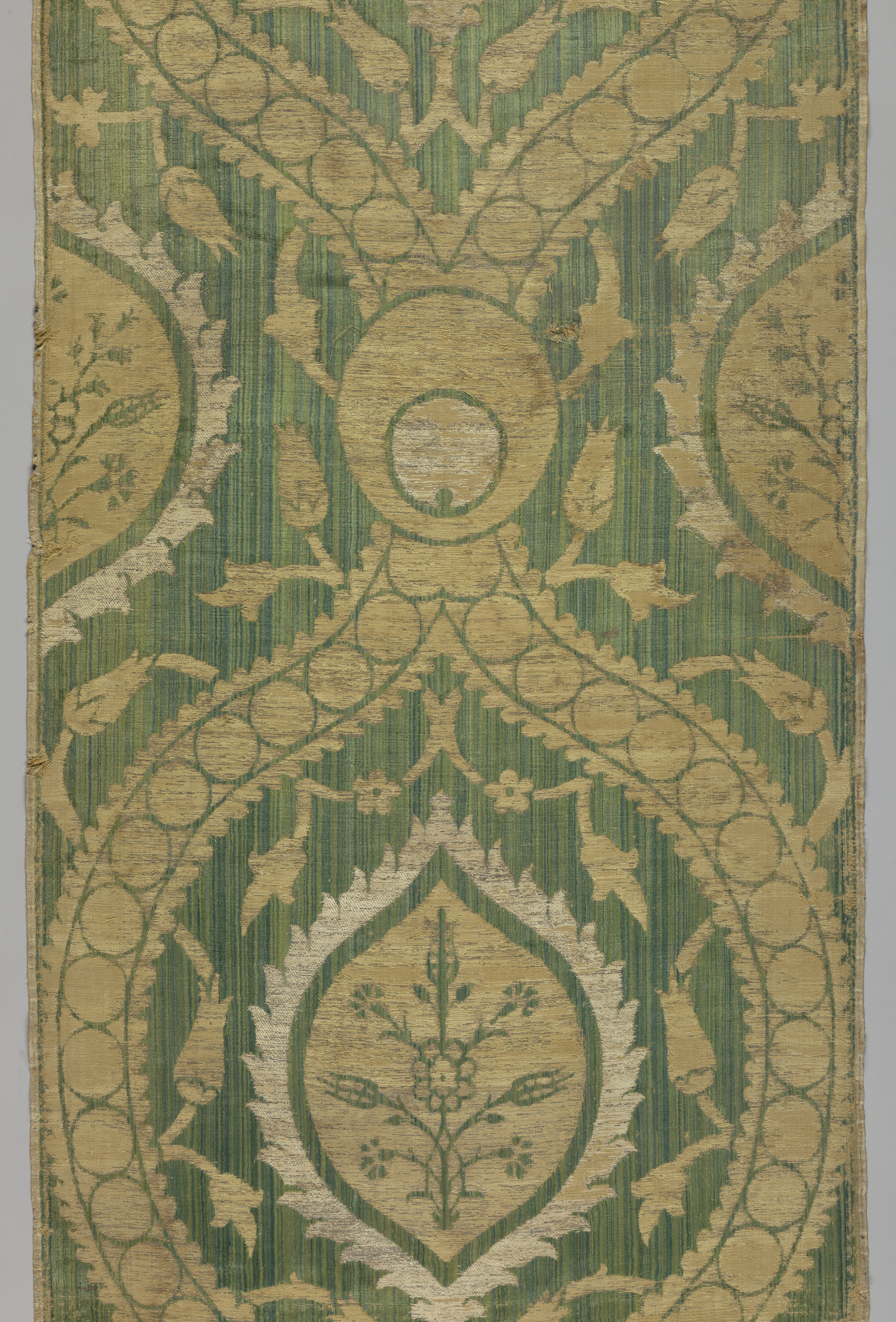 Textile; silk, cotton, metallic foil wrapped around silk; H x W: 158.1 x 64.1 cm (5 ft. 2 1/4 in. x 25 1/4 in.) Repeat H: 98.4 cm (38 3/4 in.); Gift of Harvey Smith; 1958-104-1