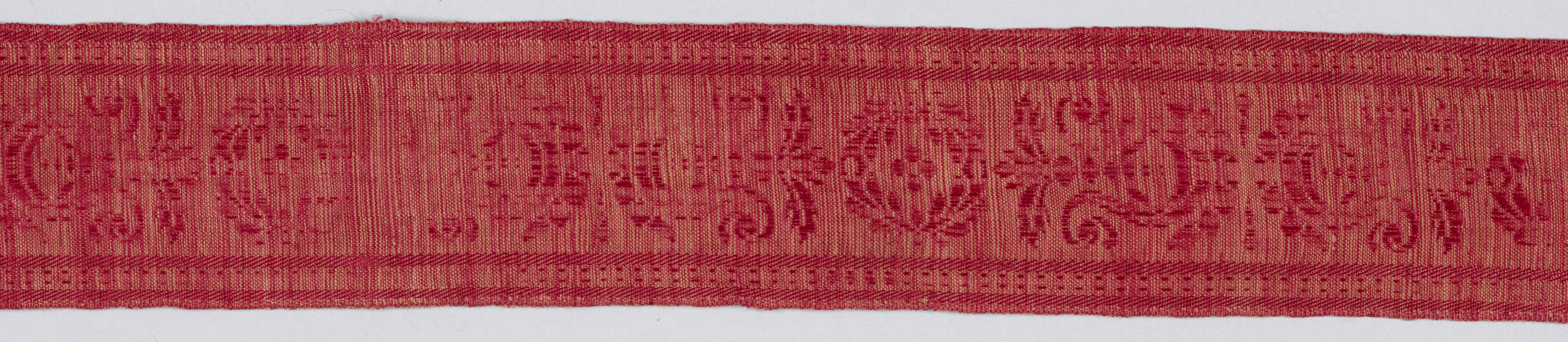 This is a Trimming. It is dated 1800–1850 and we acquired it in 1958. Its medium is wool, linen, silk and its technique is stamped. It is a part of the Textiles department.