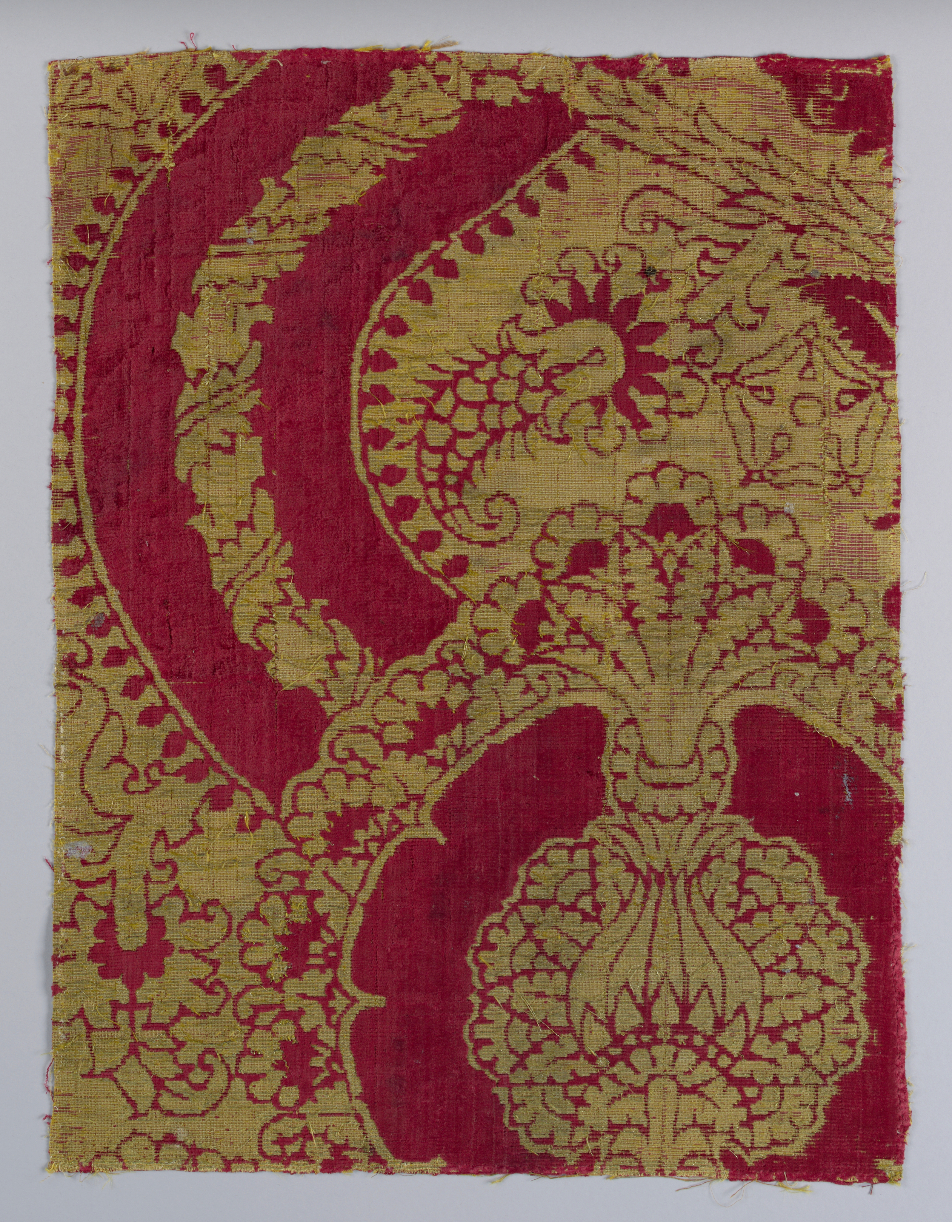 This is a Fragment. It is dated 15th century and we acquired it in 1958. Its medium is silk, metallic threads (yellow silk and gold strips wound on a silk core), linen and its technique is cut (in two heights) and voided supplementary warp pile (velvet). It is a part of the Textiles department.