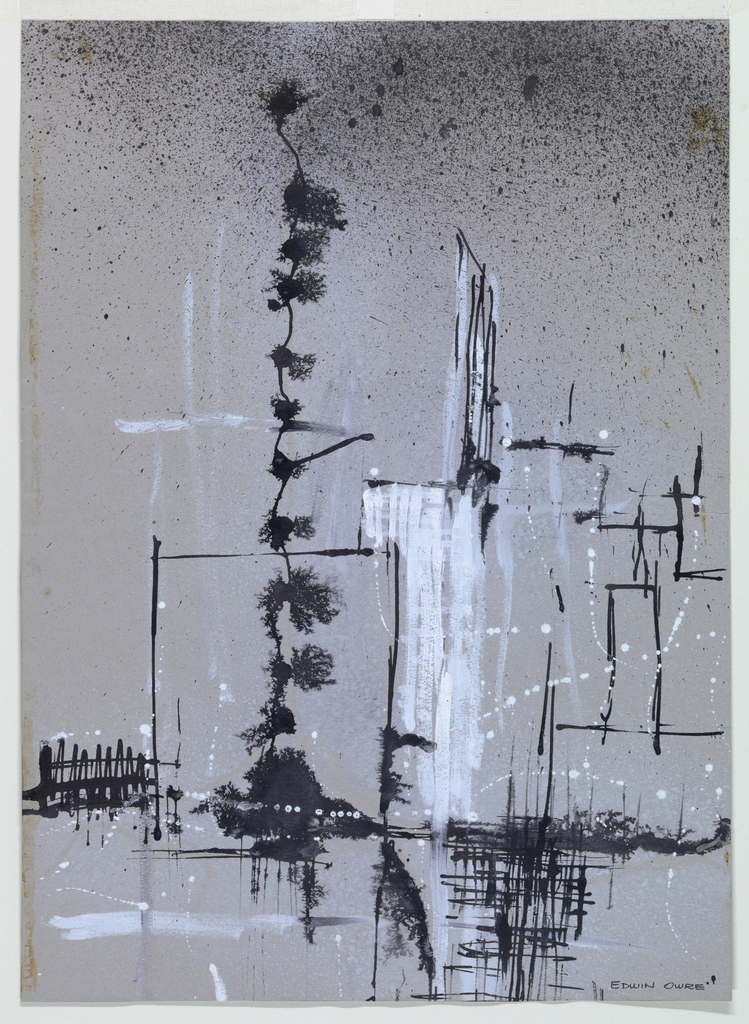 This is a Drawing. It was created by Edwin Owre. It is dated 1958 and we acquired it in 1958. Its medium is black and white opaque water-color paint on grey paper. It is a part of the Drawings, Prints, and Graphic Design department.
