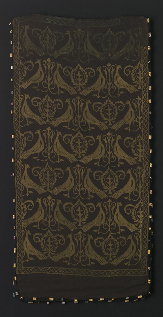 This is a Tunic. It was designed by Maria Monaci Gallenga. It is dated ca. 1925 and we acquired it in 1959. Its medium is silk, ceramic beads and its technique is printed. It is a part of the Textiles department.