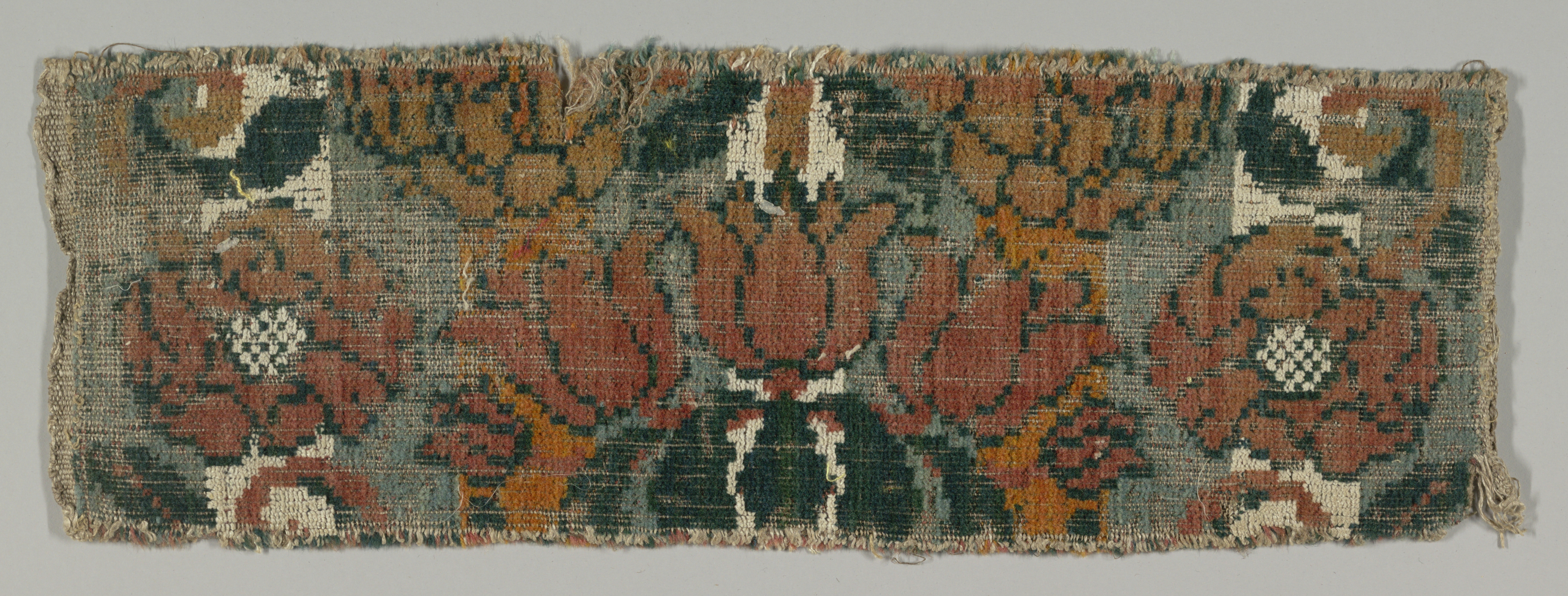This is a Carpet fragments. It is dated late 17th–18th century and we acquired it in 1959. Its medium is wool, linen or hemp, cotton and its technique is cut pile on plain weave (moquette or velours d'arras). It is a part of the Textiles department.
