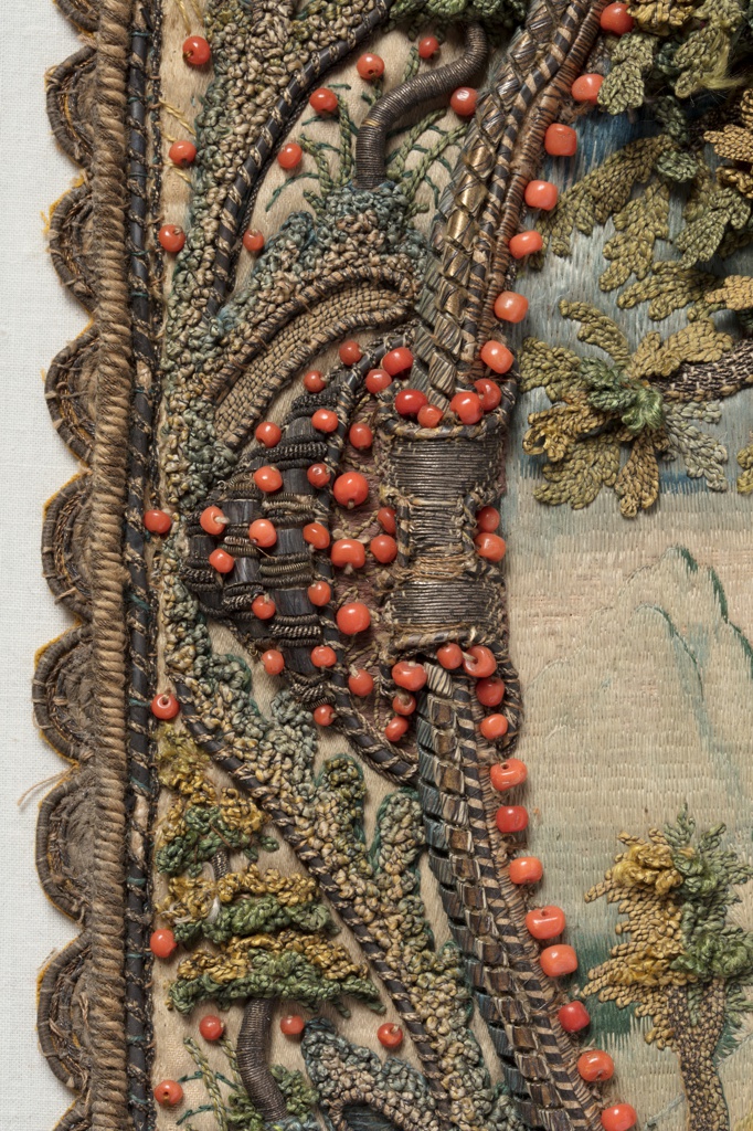 This is a Panel for a cabinet door. It is dated late 16th–early 17th century and we acquired it in 1959. Its medium is silk, metal wire, metal strips, coral beads and its technique is raised embroidery. It is a part of the Textiles department.