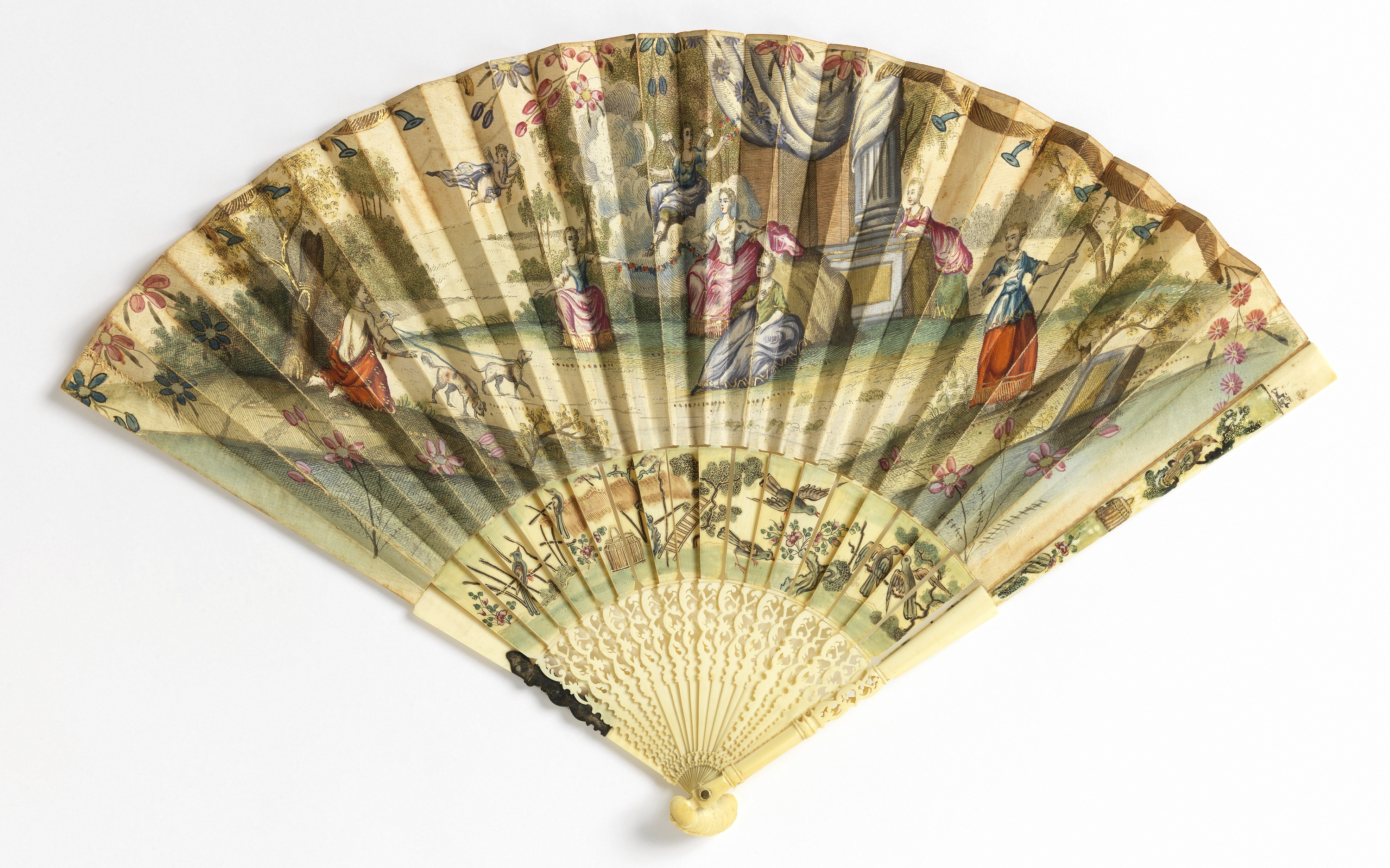 Pleated Fan (probably England); paper leaf with hand-colored etching, pierced and painted ivory sticks, rivet set with faceted stone; H x W (open): 28.5 x 47.5 cm (11 1/4 x 18 11/16 in.) H x W (closed): 28.5 x 25 cm (11 1/4 x 9 13/16 in.); Bequest of Emily H. Chauncey; 1959-156-4-a