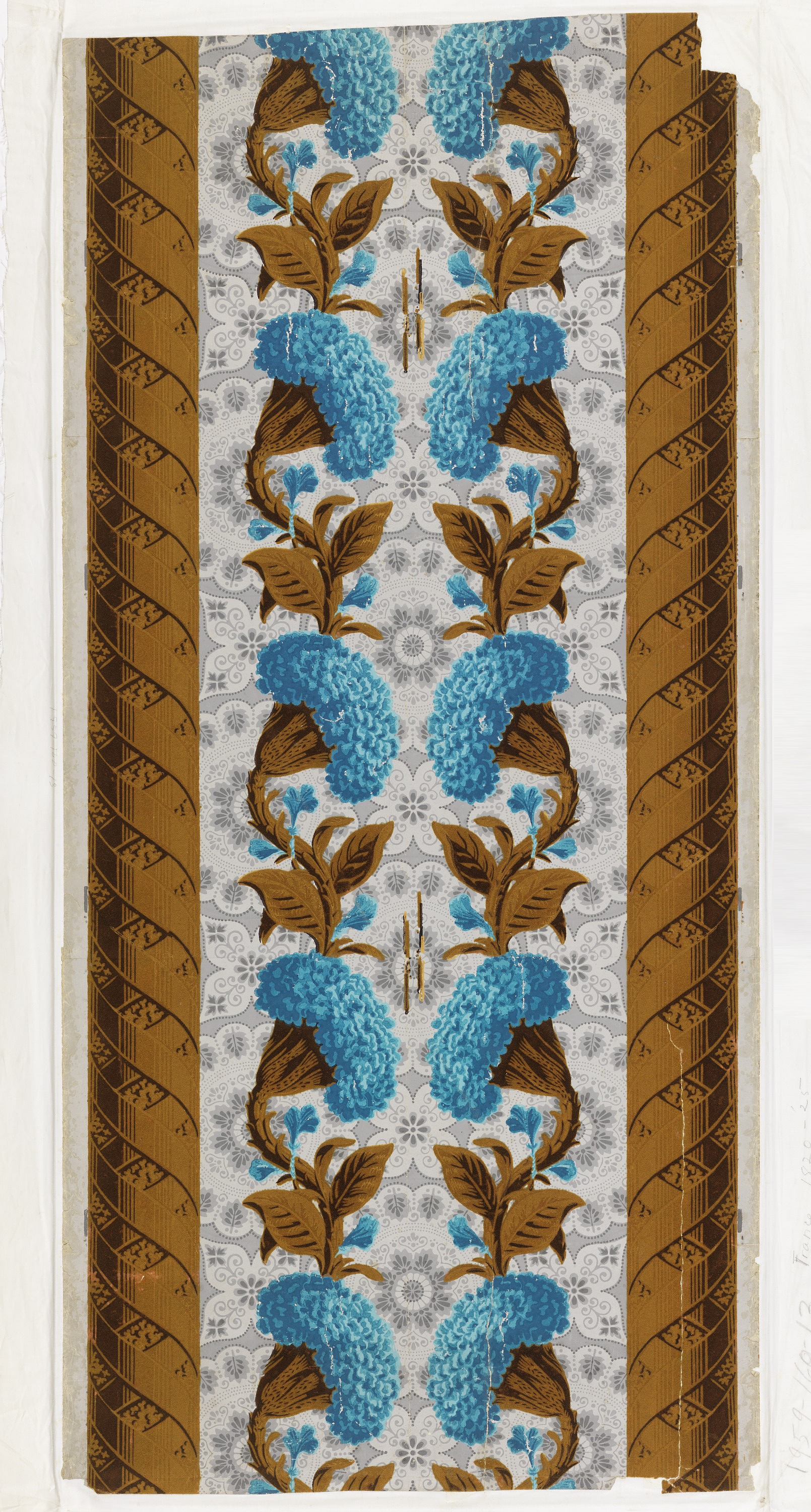 This is a Border. It is dated 1820–24 and we acquired it in 1959. Its medium is block printed and flocked on handmade paper. It is a part of the Wallcoverings department.