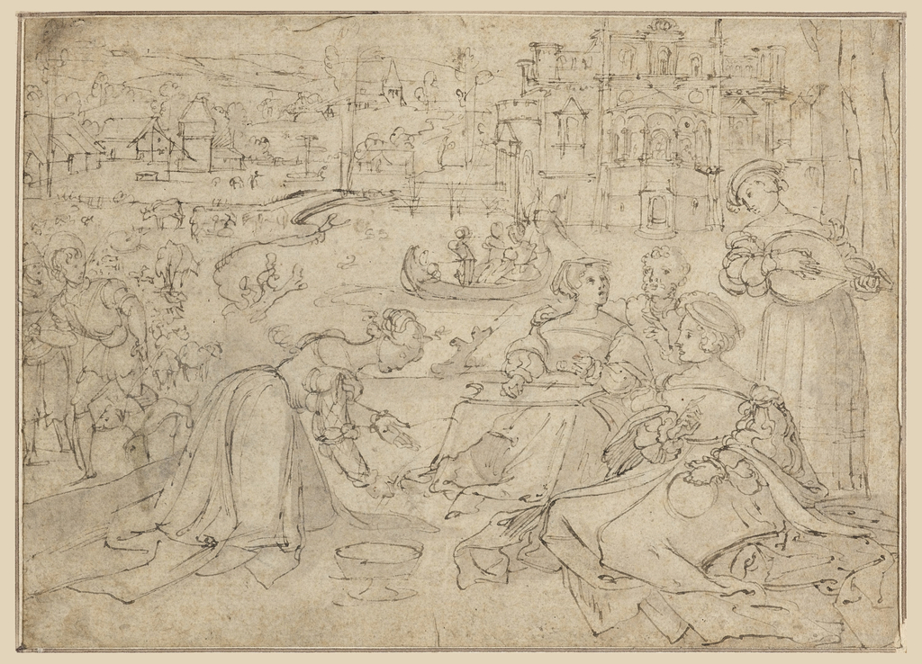 Drawing, Recto: The Month of April (Figures in a park near a castle); Verso: Youth from The Three Ages of Man (?)(Merry-makers); Possibly by Master of the Months of Lucas (Netherlandish); Attributed to Pieter Coecke van Aelst (Netherlandish, 1502 – 1550); Netherlands; pen and brown ink, brush and brown wash on cream laid paper; 15 x 21 cm (5 7/8 x 8 1/4 in.); Gift of Milton Einstein; 1959-49-221