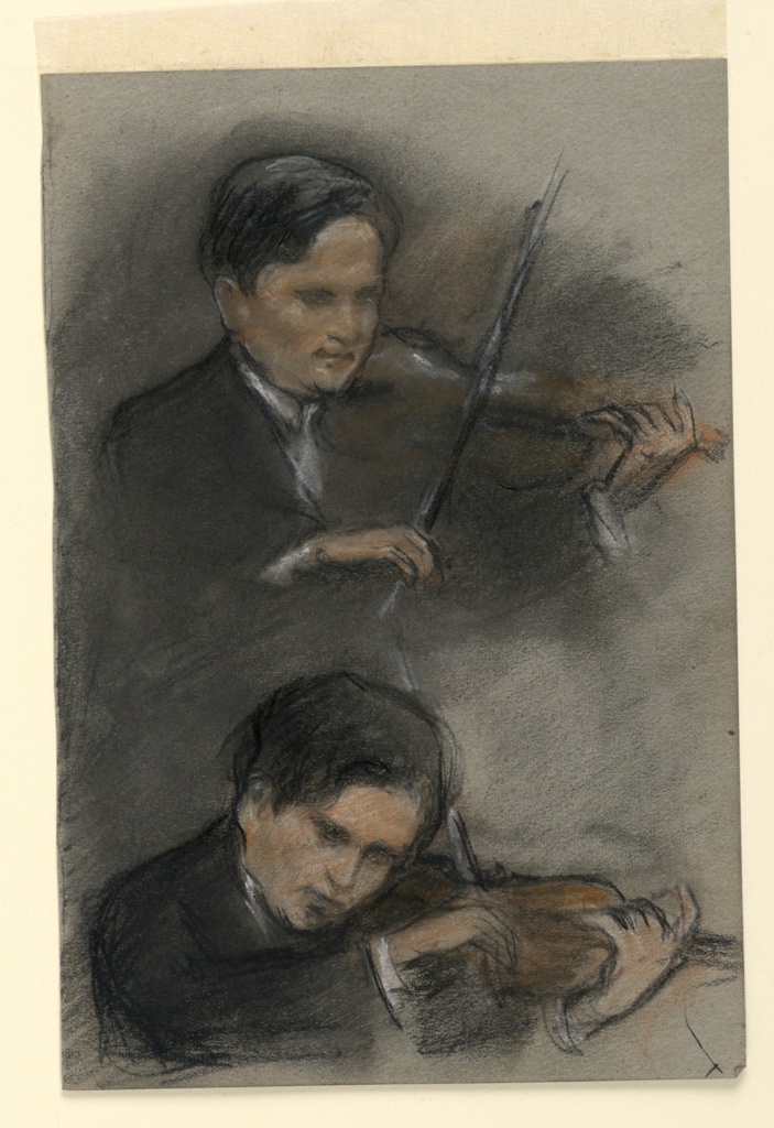 Drawing, Studies of a Violinist; Robert Ingersoll Aitken (American, 1878–1949); USA; pastel on grey paper; 19 × 13 cm (7 1/2 × 5 1/8 in.); Gift of Mrs. Robert I. Aitken; 1959-87-20