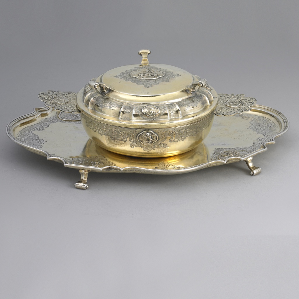On underside of tray: [1] "I E H" in a heart-shaped shield, impressed (maker’s mark) [2] A pineapple, with seven lobes, impressed (town mark, Augsburg) On surface of the tray: [1] "I E H" in a heart-shaped shield, impressed (maker’s mark) [2] A pineapple, with seven lobes, impressed (town mark, Augsburg)