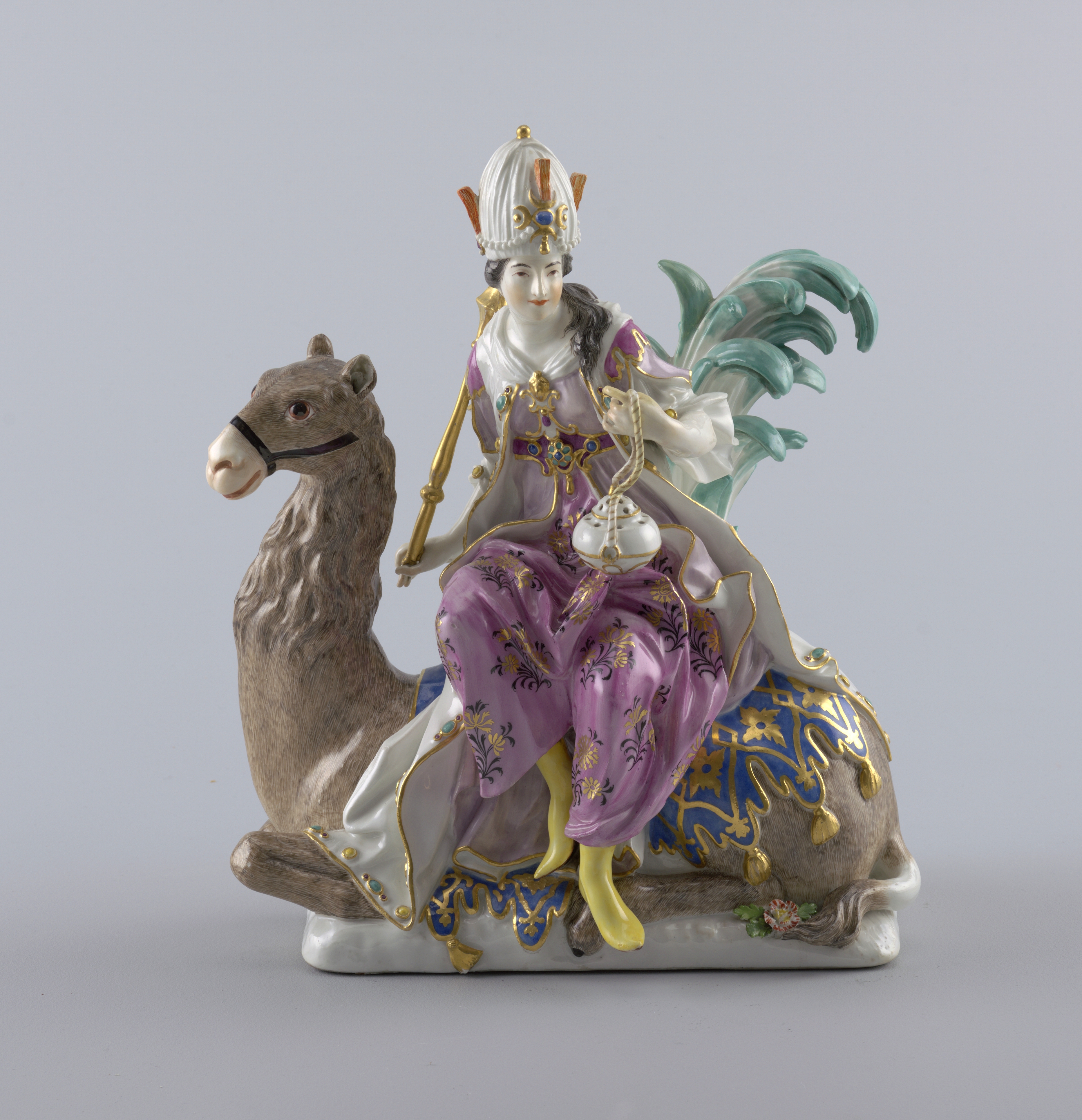 Allegorical Figure of "Asia" Figure; Attributed to Johann Friedrich Eberlein (1696 – 1749), Johann Joachim Kändler (German, 1706–1775); Modeled by Peter Reinicke (German, 1715–1768); Made by Meissen Porcelain Factory (Germany); Manufactured by Meissen Porcelain Manufactory (Germany); After Gottfried Bernhard Götz (1708–1774); Germany; hard paste porcelain, vitreous enamel, gold; H x W x D: 30 x 25.1 x 15.3 cm (11 13/16 in. x 9 7/8 in. x 6 in.); Gift of the Estate of James Hazen Hyde; 1960-1-28-a