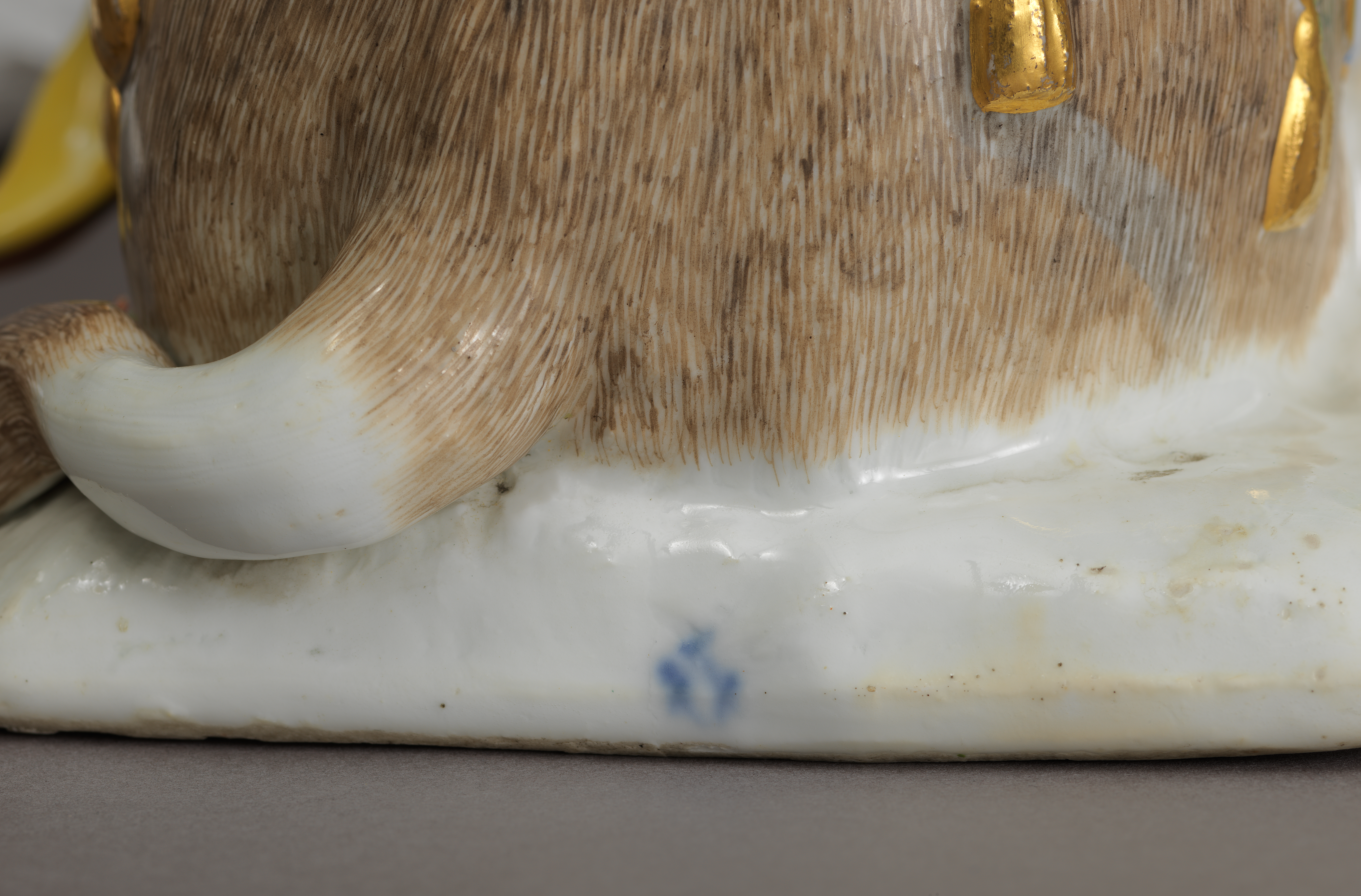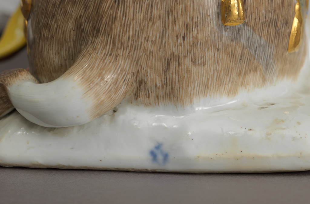 At base, beneath camel's tail: [1] double crossed swords, painted in underglaze blue (Meissen Porcelain Manufactory mark) Underside: [1] "26414", written in pencil [2] "24405", written in pencil [3] a number, written in pencil (faded)