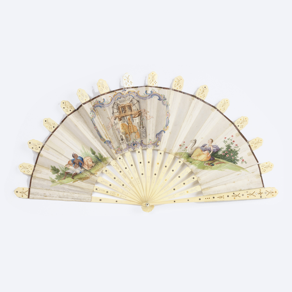 This is a Pleated fan. It is dated late 18th century and we acquired it in 1960. Its medium is painted paper leaf, pierced bone sticks with steel piqués, mother-of-pearl washer. It is a part of the Textiles department.