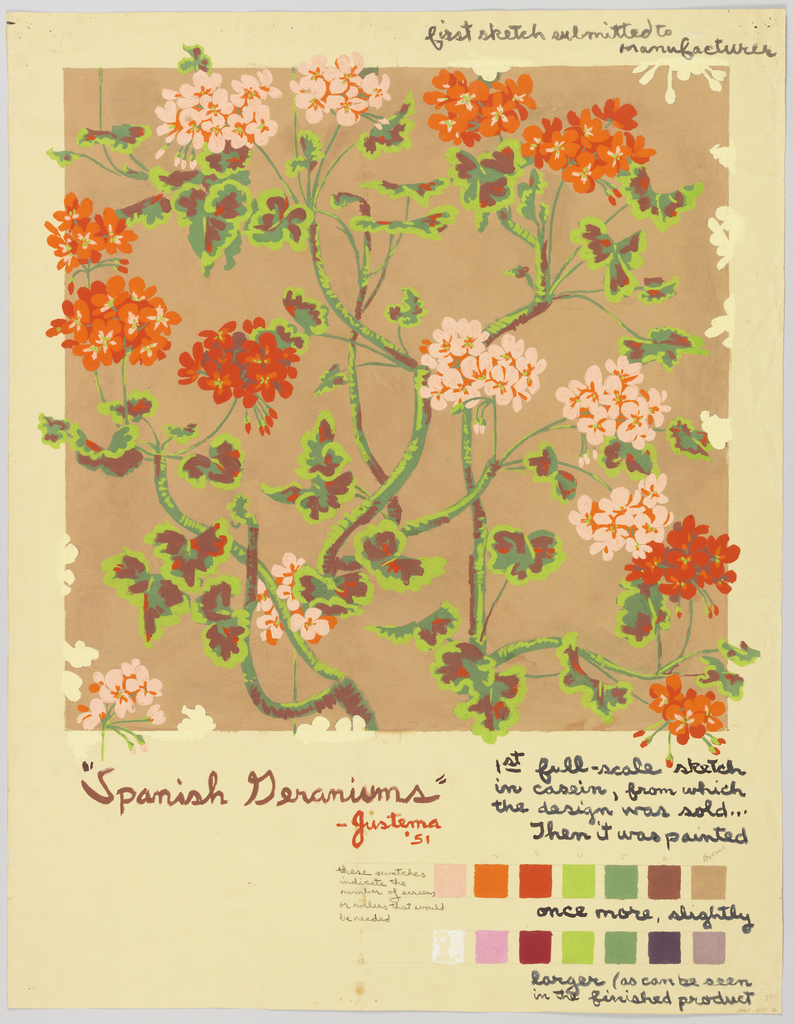 Design For Sidewall, Spanish Geraniums; USA; casein on paper; 92 x 72 cm (36 1/4 x 28 3/8 in.); Gift of William Justema; 1960-115-2