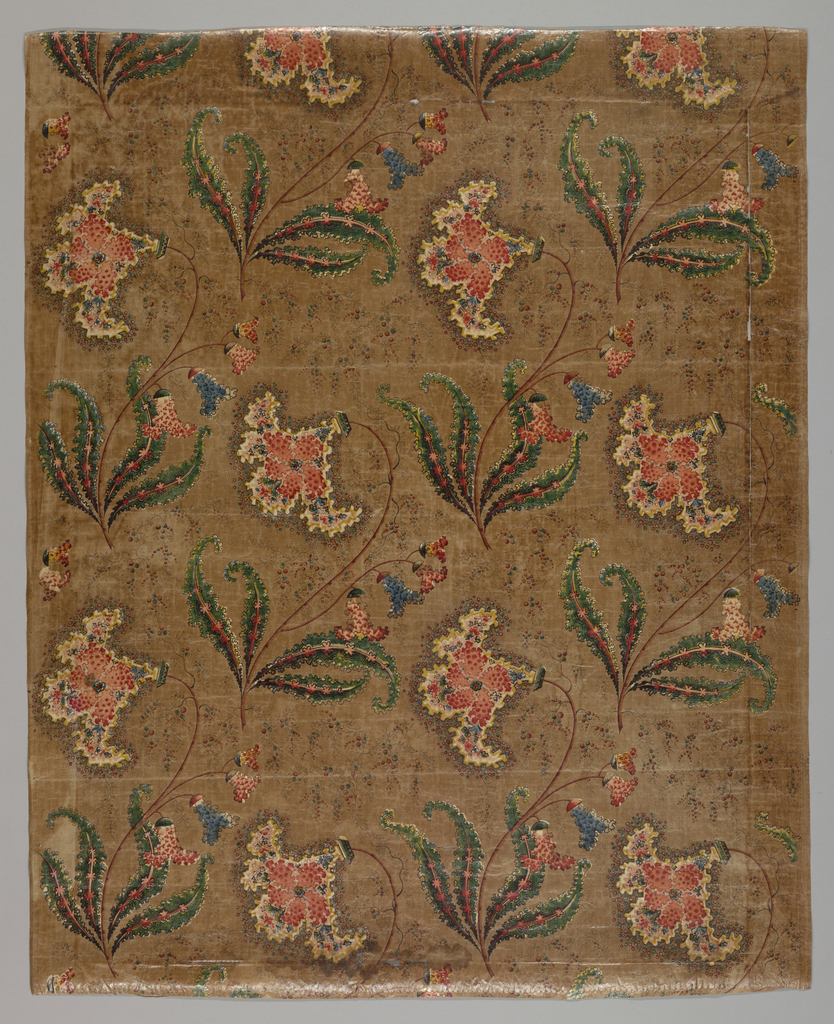 This is a Textile. It is dated 1820–25 and we acquired it in 1960. Its medium is cotton and its technique is roller and block printed. It is a part of the Textiles department.