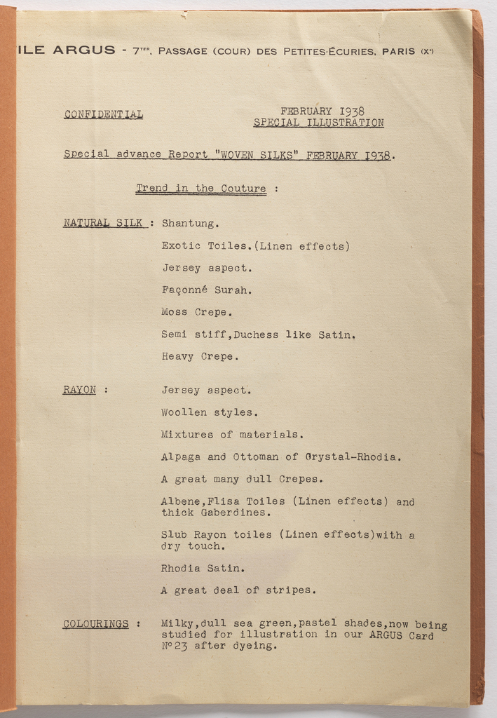 This is a Sample book. It was made by Textile Argus. It is dated 1938 and we acquired it in 1960. It is a part of the Textiles department.