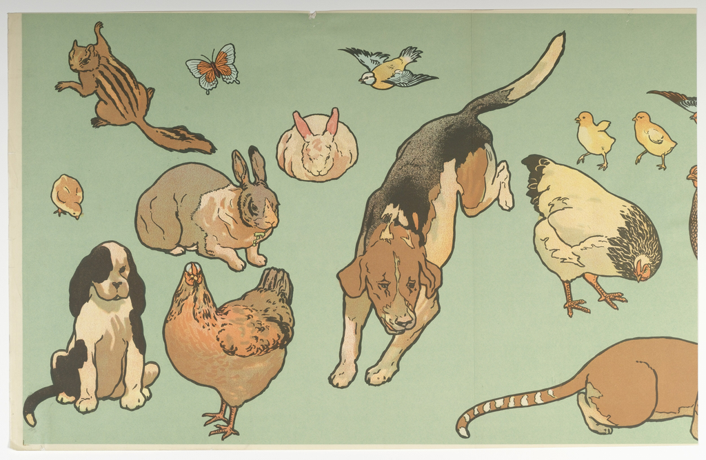 The Schmitz-Horning Company was founded in Cleveland, Ohio in 1905 and was known for its lithographed borders and scenic wallpapers. One of its early papers was “Kindergarten Cut-Outs,” the first interactive wallpaper designed for children. These papers were sold as five-foot long panels at a cost of one dollar per panel. The paper in the Museum’s collection is not a full panel—as you can see, the cat has been cut in half. The paper could be applied in panels, or hung as a frieze with the decoration running continuously around the room. As the name "Kindergarten Cut-Outs” suggests, the animals could also be cut out and pasted to the wall, or they could be pinned to a fabric wallcovering to serve as both toy and decoration.