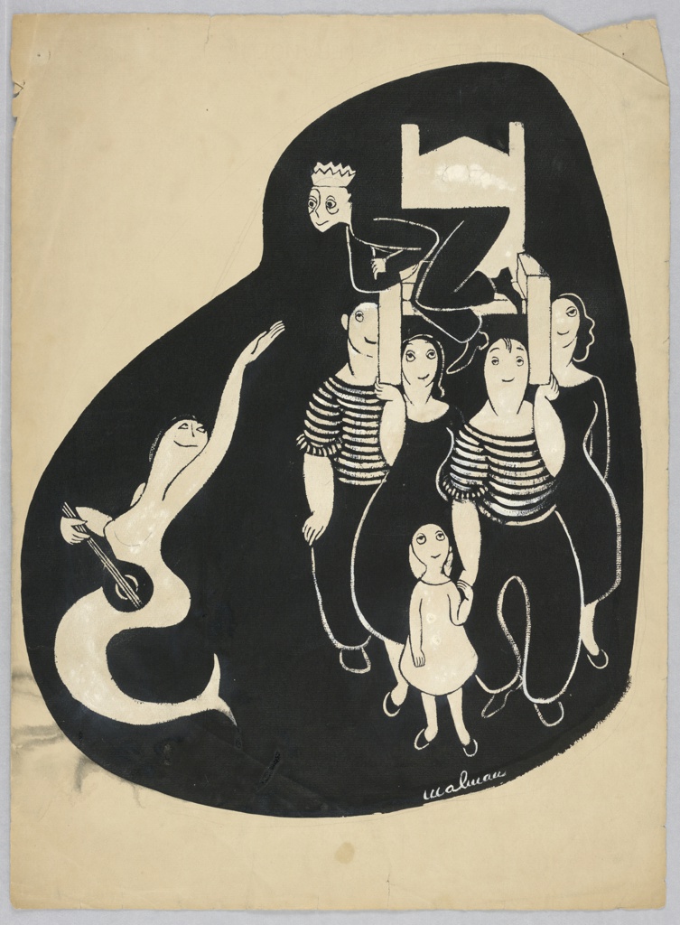 Drawing, Crowned Boy Held Aloft on a Chair, Being Waved to by a Siren; Christina Malman (American, b. England, 1911–1959); USA; pen and ink, brush and ink, white gouache, graphite on cream paper; 47.9 × 35 cm (18 7/8 × 13 3/4 in.); 1960-214-101