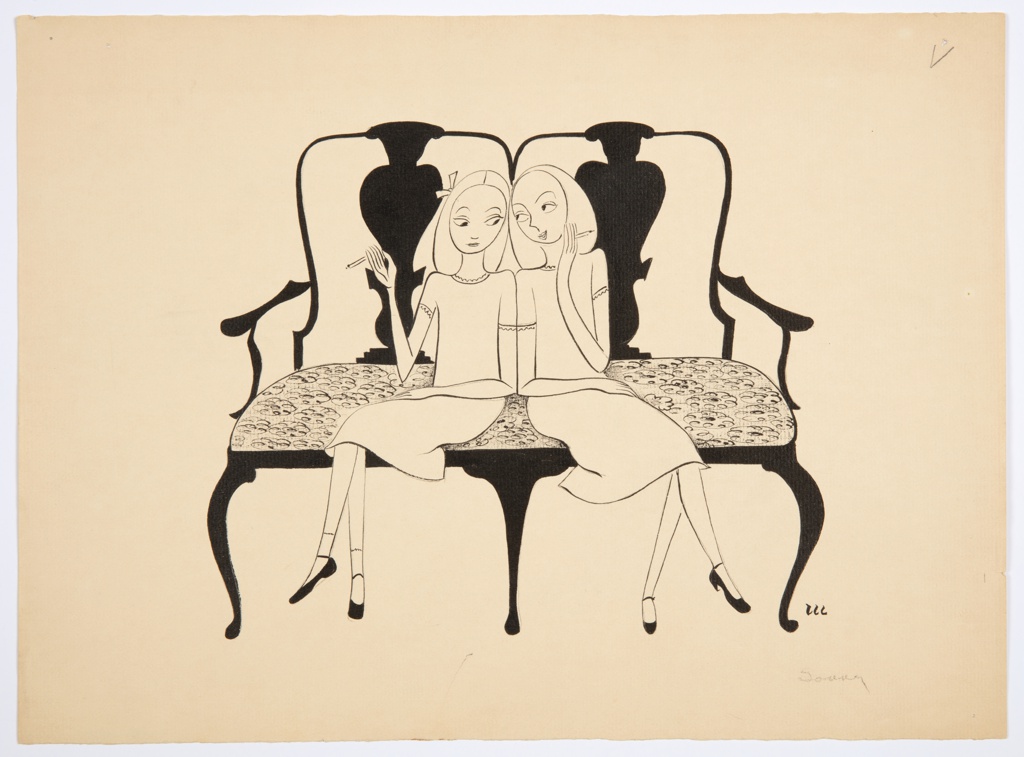 Drawing, Two Young Girls Seated on a Sofa Smoking; Christina Malman (American, b. England, 1911–1959); USA; pen and ink, brush and ink, graphite on cream paper; 27.3 × 37.1 cm (10 3/4 × 14 5/8 in.); 1960-214-105