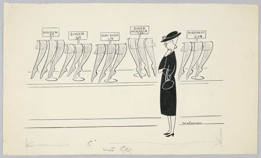 Drawing, Woman at a Stocking Counter; Christina Malman (American, b. England, 1911–1959); Client: Consumer's Union; USA; pen and ink, brush and white gouache, graphite on cream paper; 28.8 × 48 cm (11 5/16 × 18 7/8 in.); 1960-214-74